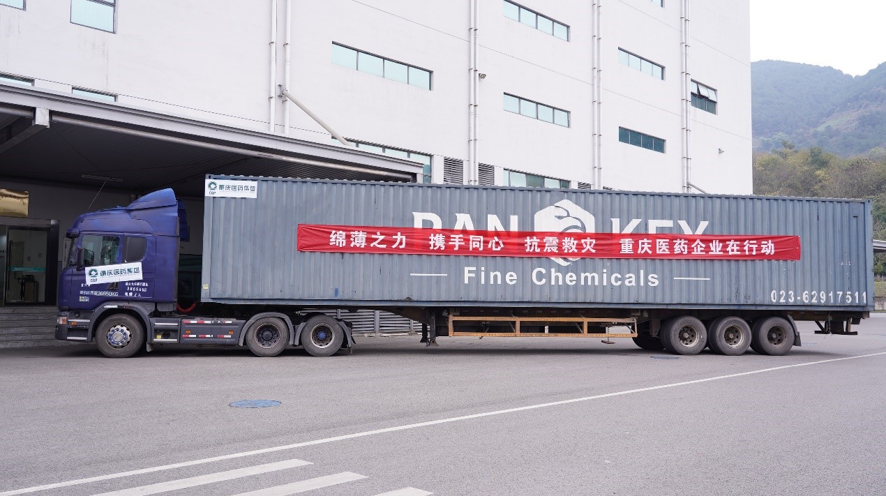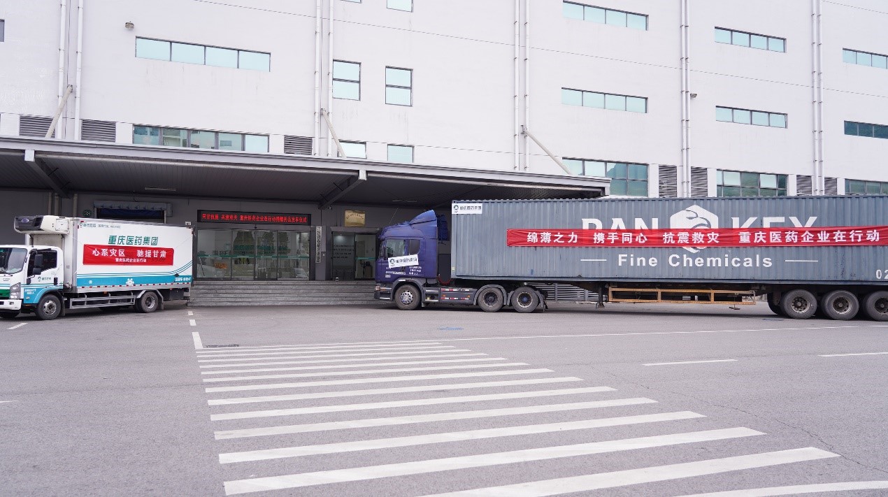 2023年12月22日下午3點(diǎn),重慶市沙坪壩區(qū)土主鎮(zhèn)明珠山一支路和平物流園區(qū),兩臺(tái)大貨車滿載醫(yī)藥物資整裝待發(fā),車身上,“綿薄之力,攜手同心,抗震救災(zāi),重慶醫(yī)藥企業(yè)在行動(dòng)”,“心系災(zāi)區(qū),馳援甘肅”的大紅橫幅分外醒目,一場(chǎng)簡(jiǎn)短的捐贈(zèng)儀式在這里舉行。