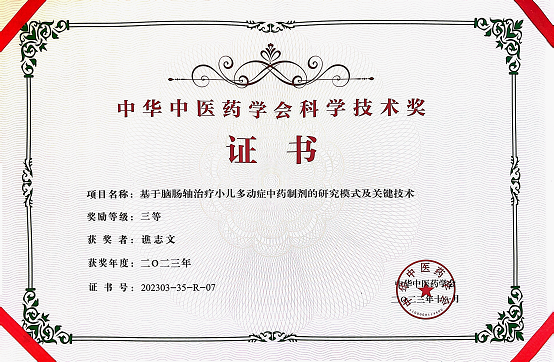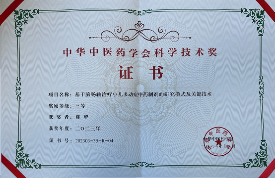重慶希爾安藥業(yè)有限公司作為主要完成單位,憑借小兒黃龍顆粒等品種的研究成果,申報了《基于腦腸軸治療小兒多動癥中藥制劑的研究模式及關(guān)鍵技術(shù)》項(xiàng)目,榮獲了2023年度中華中醫(yī)藥學(xué)會科學(xué)技術(shù)獎三等獎。希爾安藥業(yè)總經(jīng)理陳犁和希爾安藥業(yè)技術(shù)中心副總經(jīng)理譙志文作為該項(xiàng)目的主要完成人,共同獲得了此殊榮。